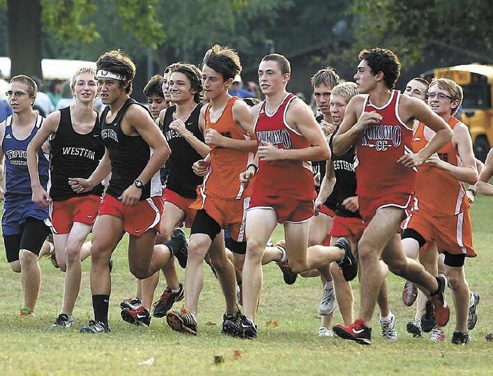 ![]() AND THEY’RE OFF: Western and Kokomo runners are among a pack breaking away from the starting line in a five-team boys cross country meet on Tuesday at Oakbrook Valley Park. Western won the meet with a score of 35 and Kokomo finished in third. KT photo |