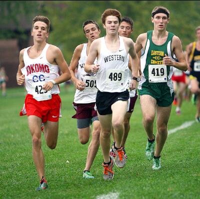 KT photo | Tim Bath STATE BOUND: Kokomo's Jeremy Breedlove, left to right, Western's Matt Grider and Eastern's Lewis Duke are shown leading the pack in the Logansport Sectional. The three seniors will run Saturday in the state meet at Terre Haute.